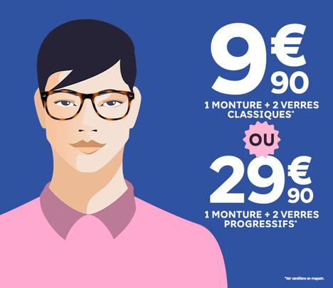 Rendez-vous en magasin pour bénéficier d'une monture + 2 verres classiques à 9,90€ ou d'une monture + 2 verres progressifs à 29,90€.